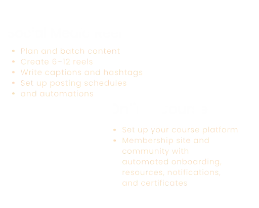 Online Courses & Memberships: We set up and structure online courses or membership sites, automate onboarding and notifications, design and upload course materials, deliver certificates, and create community platforms for seamless engagement.